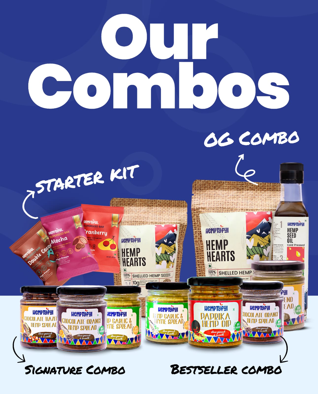 Our curated combinations feature premium hemp products, including Hemp Hearts, cold-pressed hemp seed oil, Superseed Bars, and Hemp Butters. Each combo is thoughtfully crafted to provide you with a convenient and nutritious way to enjoy the goodness of hemp in various forms. Whether you're looking for a protein-packed snack or a versatile ingredient for your recipes, our combos offer a perfect solution.