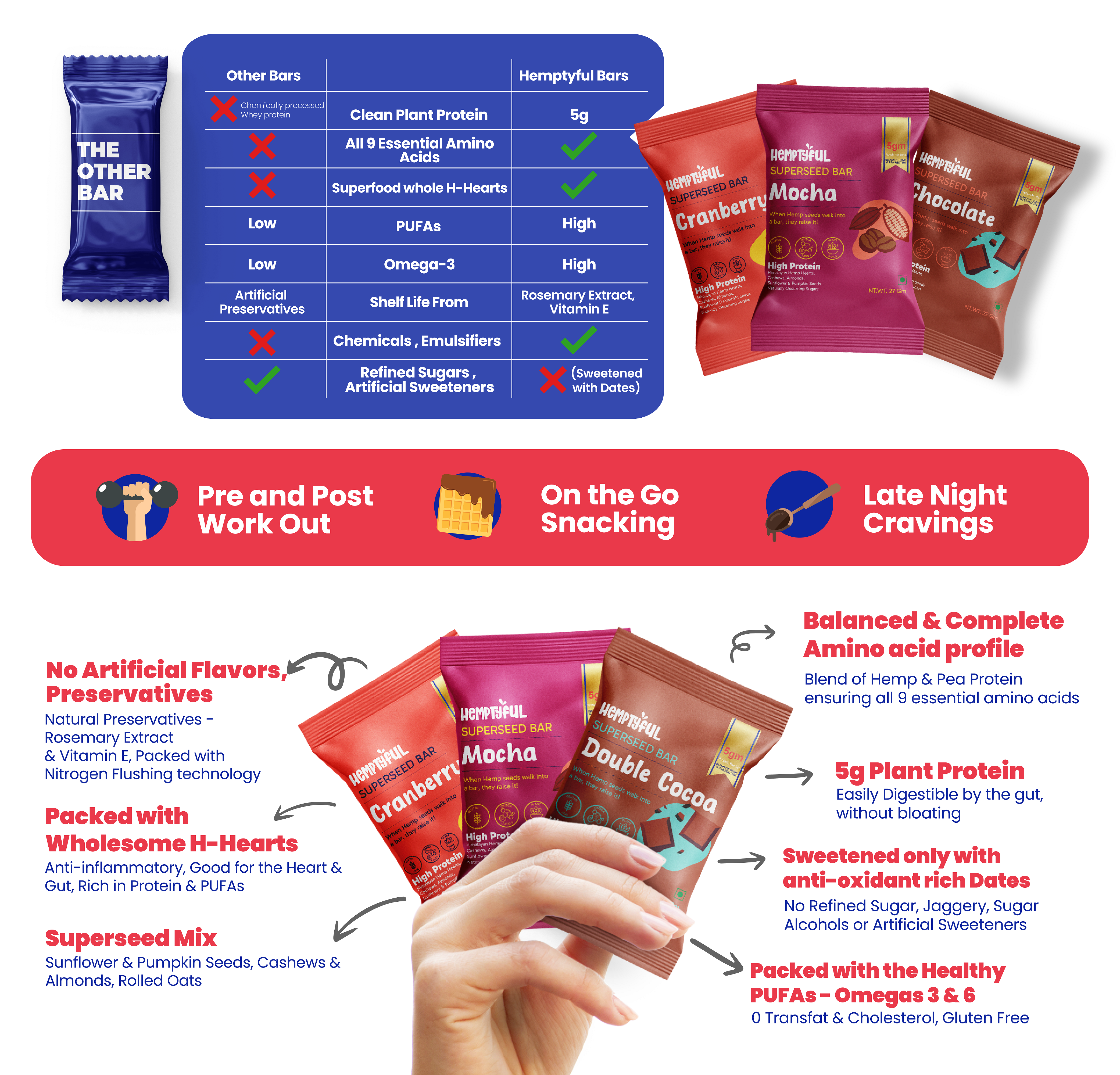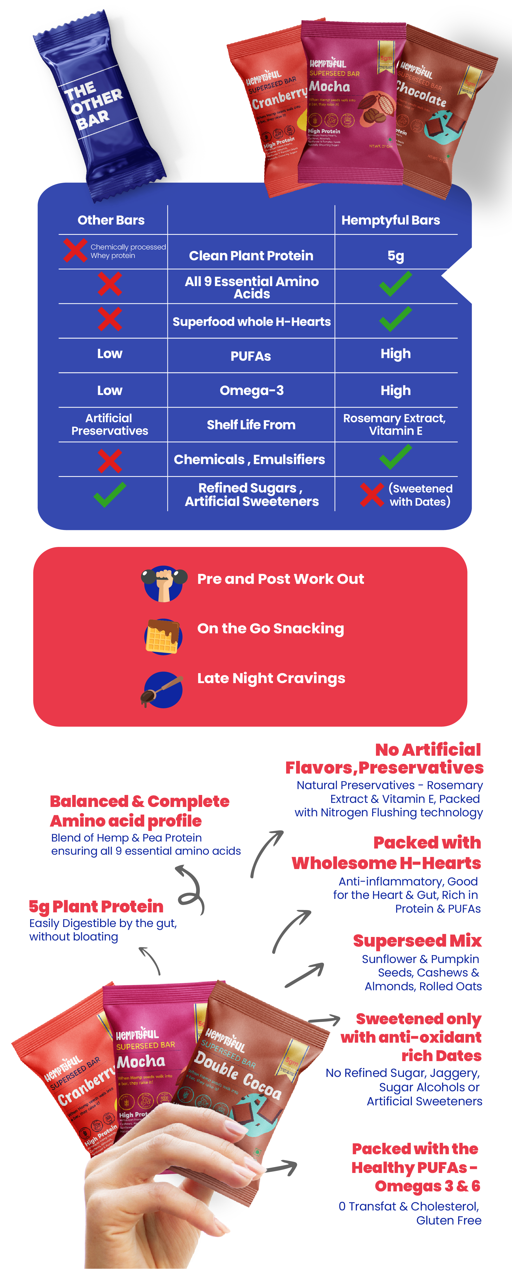Our bars are crafted with hemp hearts, not raw hemp seeds or hemp flour, to maximize the benefits of plant-based protein, omega-3 fatty acids, and other nutrients. The addition of pea protein enhances the amino acid profile, making it a balanced and wholesome snack.