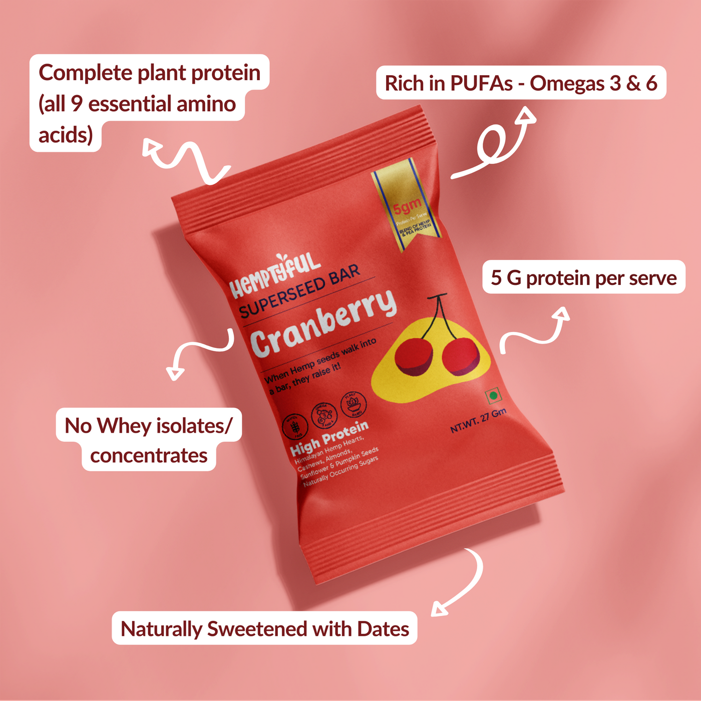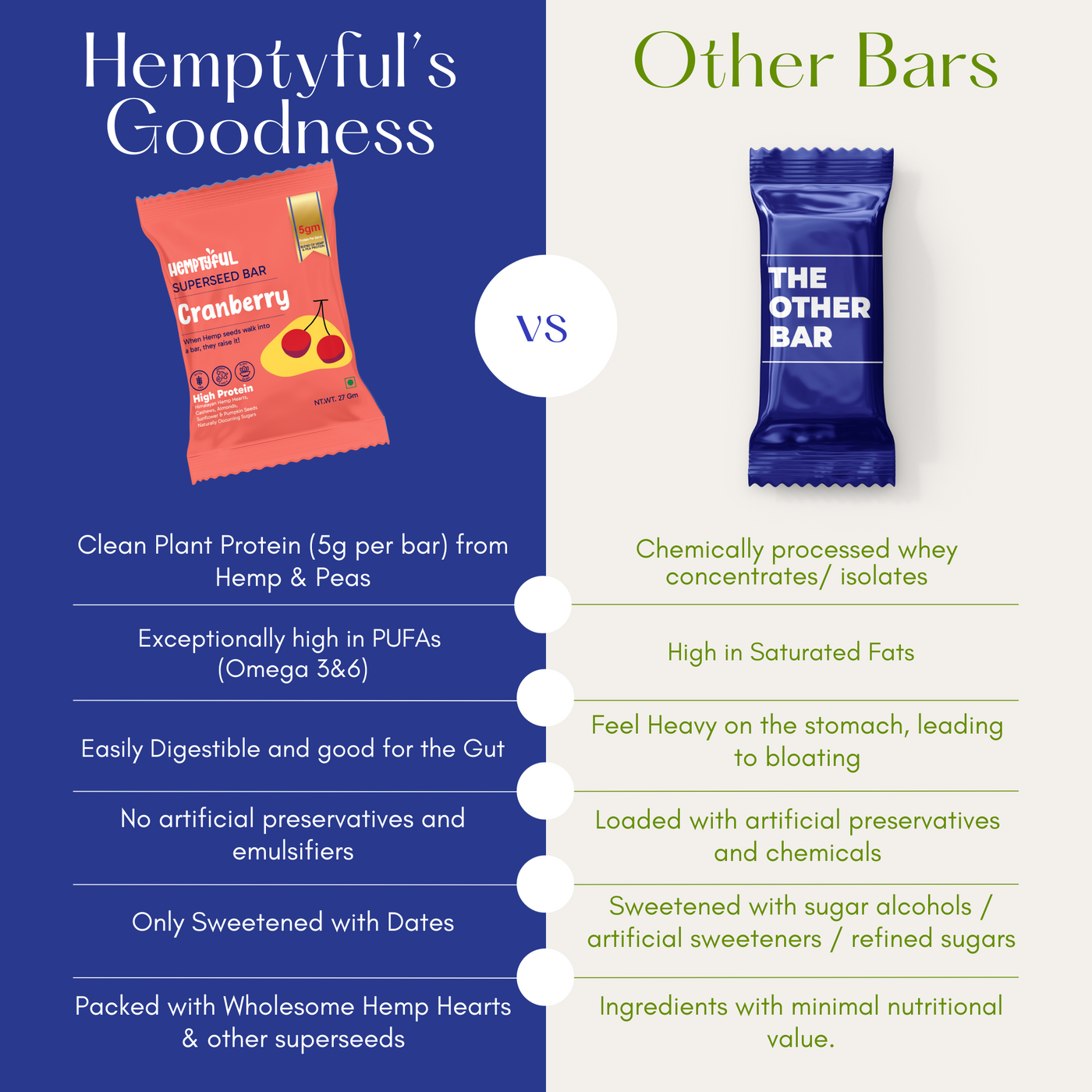 Our bars are crafted with hemp hearts, not raw hemp seeds or hemp flour, to maximize the benefits of plant-based protein, omega-3 fatty acids, and other nutrients. The addition of pea protein enhances the amino acid profile, making it a balanced and wholesome snack.